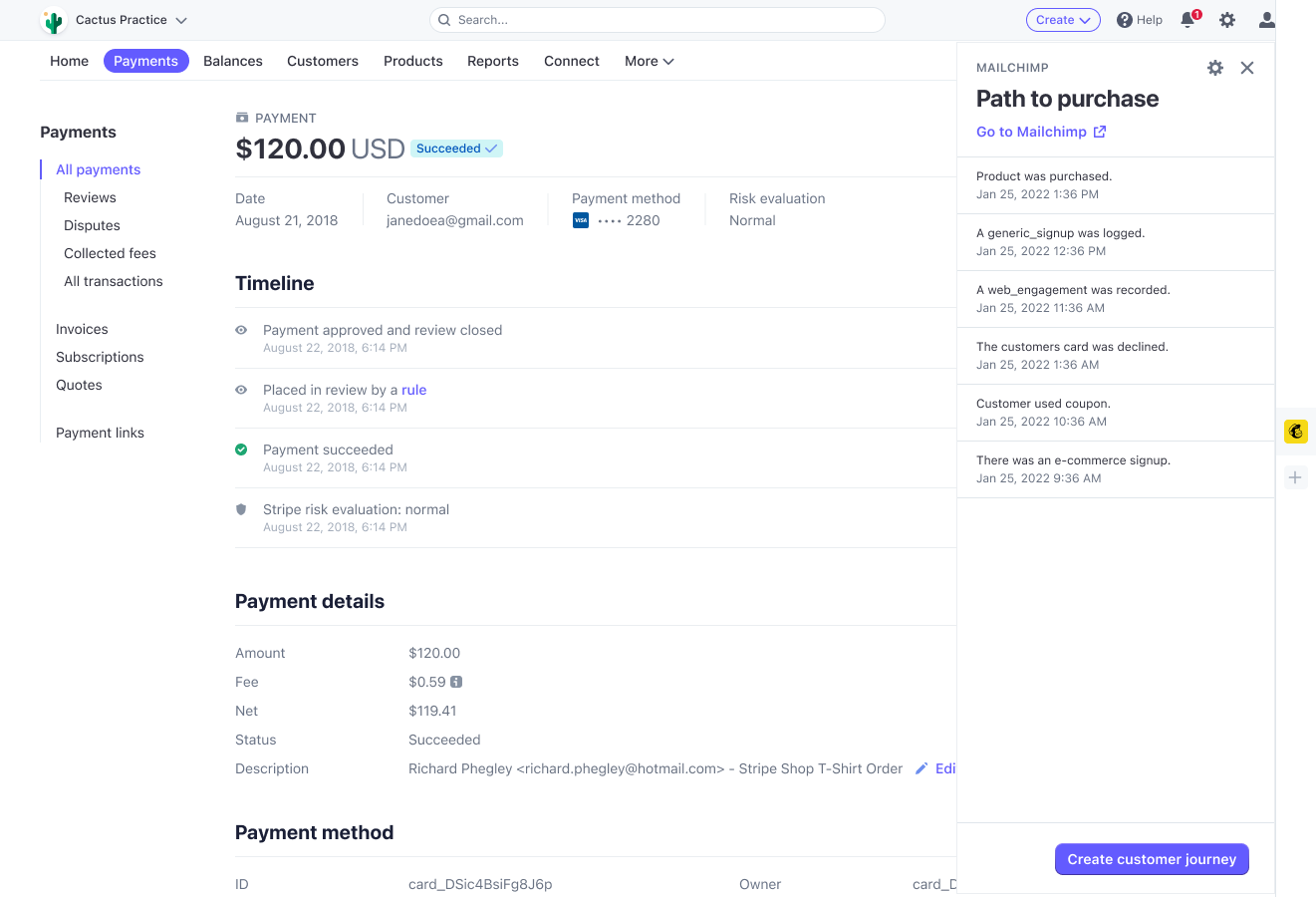 Send branded, personalized email campaigns or automated messages to people who have purchased from you. Customers and subscribers are automatically added to your Mailchimp audience so you can quickly segment and send relevant messages to an engaged audience, and view your Mailchimp Store performance data in the Stripe dashboard.